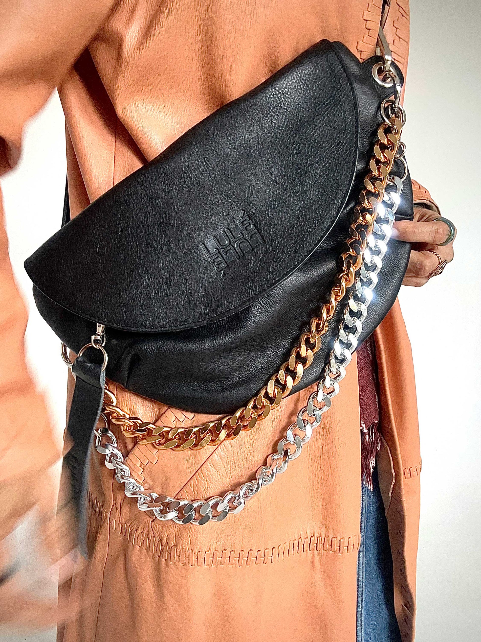 Reptilia Bag XL, un manos libres elaborado en cuero de alta calidad. Mide 35 cm en su parte más amplia y 20 cm de alto; su capacidad interior varía entre 8 y 10 cm. ¡Más grande, más conveniente! Tiene cierre y broche en su tapa para mayor seguridad. ¡Tiene dos bolsillos interiores y el espacio ideal para tu día a día! Su cargadera es ajustable.